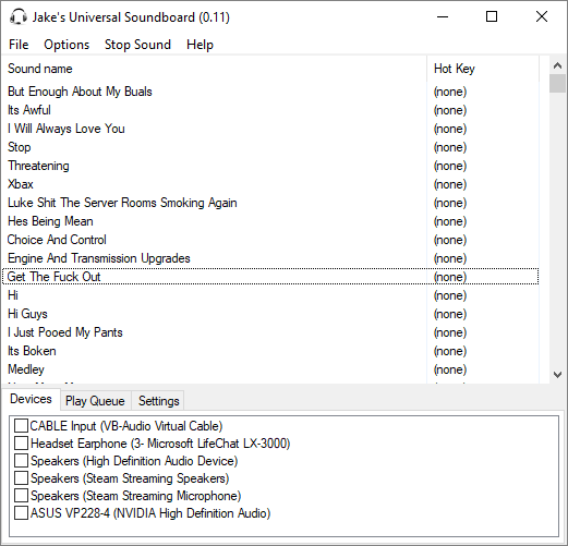 Jake's Universal Soundboard is a lightweight and intuitive program developed in C# that allows users to play sound files across multiple audio devices seamlessly. Whether you're streaming, gaming, or just having fun, this versatile tool is designed to bring your audio playback needs to life with ease.